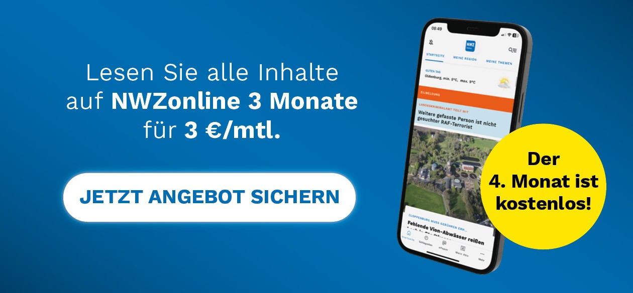Alle Preise inkl. MwSt. Das Angebot ist gültig bis zum 31.12.2026. Sie zahlen in den ersten 3 Monaten 3,00€ im Monat für das NWZonline Abo. Die Kündigungsfrist zum Ende der Mindestvertragslaufzeit von 3 Monaten beträgt 2 Wochen. Der 4. Monat ist kostenlos. Ab dem 5. Monat gilt der dann regulär geltende monatliche Bezugspreis für NWZonline und eine monatliche Kündbarkeit mit einer Frist von 14 Tagen zum Monatsende.
